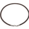 Este minimalista cordón gargantilla Bvlgari presenta un cordón de cuero marrón con un cierre de acero inoxidable. El grosor es de 5 mm. La longitud es de 15,5 pulgadas. El peso es de 12,8 g.