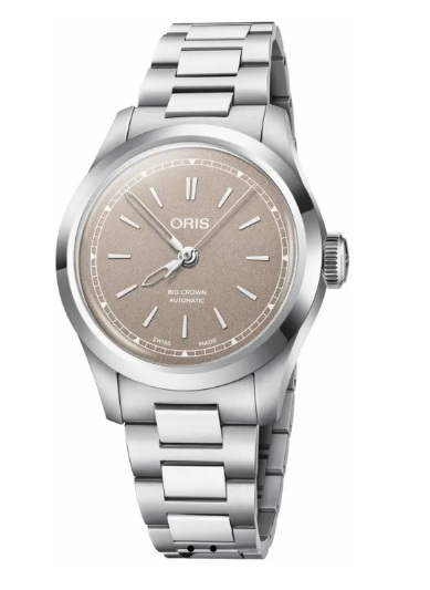 Presentamos el Big Crown automático de 34,00 mm, una nueva iteración de nuestro diseño icónico para mujeres, o para personas con la muñeca pequeña. Cuenta con una esfera marrone texturizada y agujas tipo esqueleto, pulsera metálica con eslabones en H y movimiento mecánico automático.