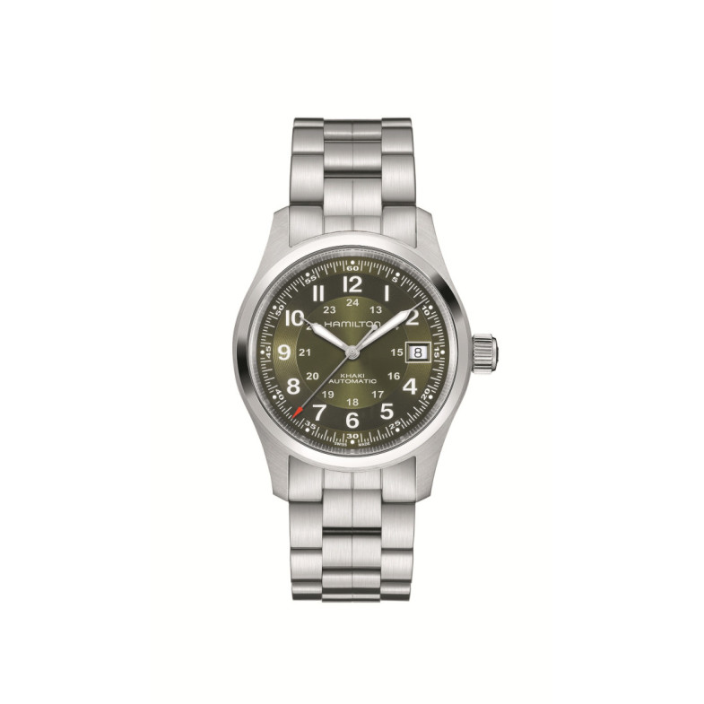 Inspirado en el reloj de soldado original, el Khaki Field Automatic combina el legado militar con el diseño contemporáneo, ofreciendo versatilidad para los pioneros modernos. Su esfera verde caqui con acabado de rayos de sol y un efecto en espiral en el anillo de las horas, refleja la luz a la vez que ofrece textura y profundidad. Diseñado para la acción y preparado para la aventura, su exclusivo calibre automático H-10 ofrece hasta 80 horas de reserva de marcha, asegurando un rendimiento fiable en cualquier situación. Descubre nuestra colección Khaki Field.