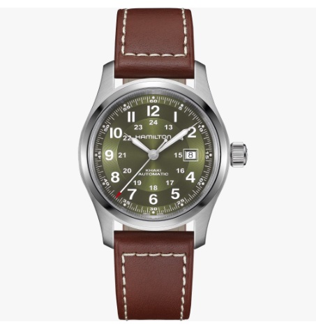 Inspirado en el reloj de soldado original, el Khaki Field Automatic combina el legado militar con el diseño contemporáneo, ofreciendo versatilidad para los pioneros modernos. Su esfera verde caqui con acabado de rayos de sol y un efecto en espiral en el anillo de las horas, refleja la luz a la vez que ofrece textura y profundidad. Diseñado para la acción y preparado para la aventura, su exclusivo calibre automático H-10 ofrece hasta 80 horas de reserva de marcha, asegurando un rendimiento fiable en cualquier situación. Descubre nuestra colección Khaki Field.