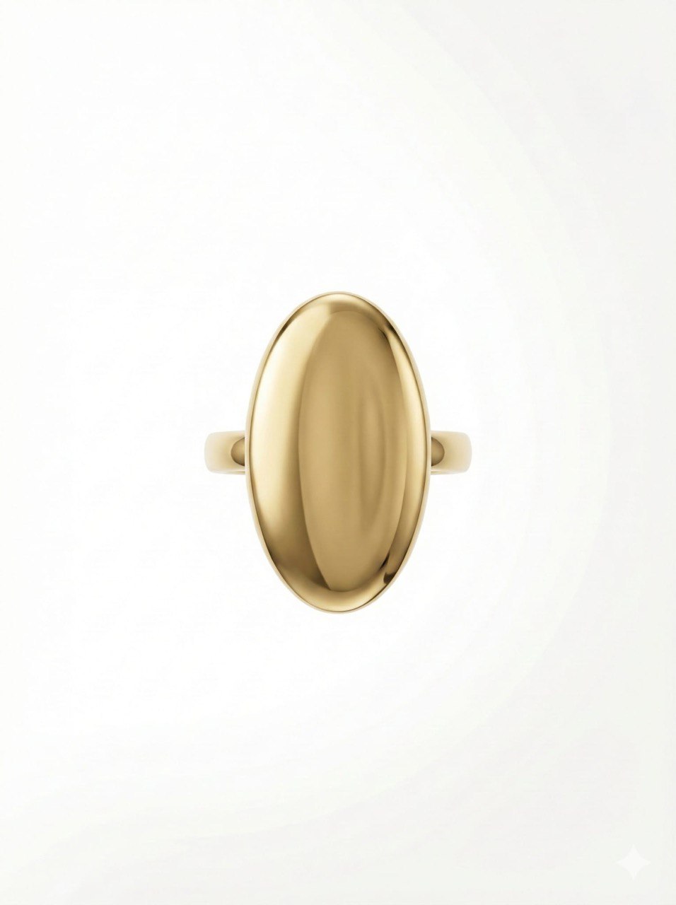 Anillo de oro de 18 quilates en forma de lanzadera peladilla oval de 15×25 mm. Una pieza escultórica de diseño atrevido y minimalista, con volumen y presencia en el dedo.