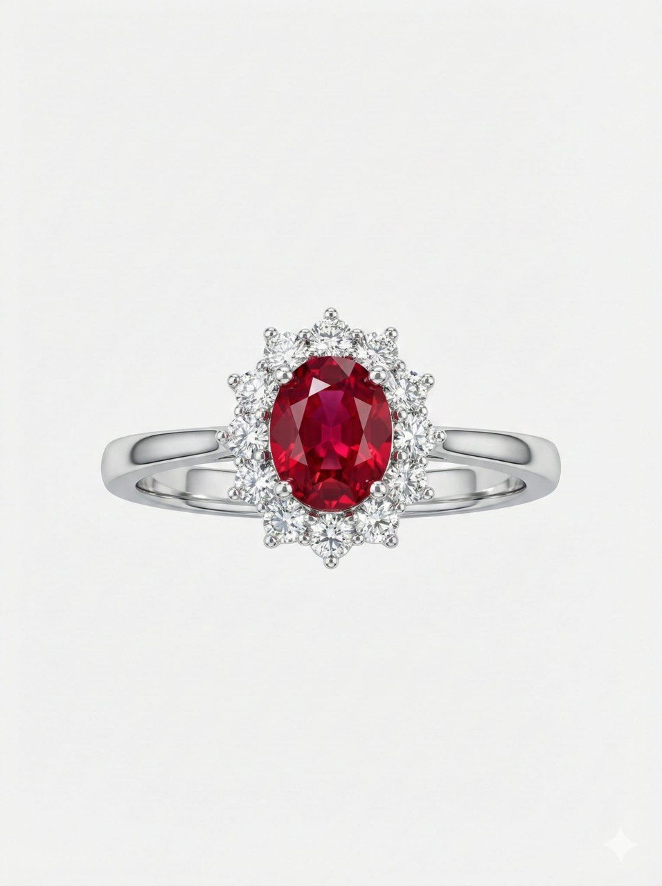 Anillo de oro blanco de 18 quilates con diamantes naturales blancos talla brillante de 0,15 ct y rubí natural de 6×4 mm con 0,55 ct. Un diseño clásico tipo rosetón que realza la belleza del rubí central rodeado de brillantes.