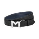 Hebilla «M» paladiada. Correa autoajustable reversible, 3,5 cm x 120 cm, de piel negra con motivo “M” emblemático grabado por un lado y piel lisa azul por el otro para ofrecer un look deportivo y sofisticado.