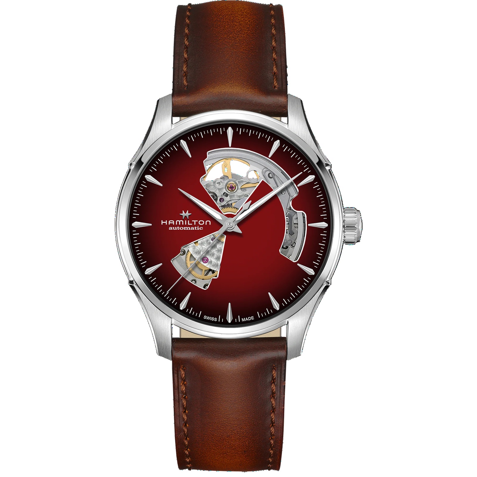 La precisión cobra protagonismo con el Jazzmaster Open Heart 40 mm, cuya esfera calada burdeos con acabado ahumado revela la sutil belleza de la mecánica interna de este reloj. El Jazzmaster Open Heart, en el que destaca el movimiento automático H-10-S, con una reserva de marcha de 80 horas y un resorte regulador de Nivachron™, se combina con una correa de piel marrón con acabado ahumado a juego, que refleja la excelencia artesanal en constante evolución y el detallismo que distinguen a Hamilton.