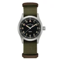 El Khaki Field Quartz expresa el regreso al legado militar de Hamilton a través de la sencillez en el diseño. La esfera presenta una tipografía clara con números arábigos más rectos y un minutero de vía ferroviaria. La paleta de colores es discreta, con su elegante esfera negra realzada con índices con Super-LumiNova® color radio envejecido. El reloj incluye una correa NATO de tejido verde y pasadores de piel color marrón, perfecta para tu próxima aventura en cualquier terreno.